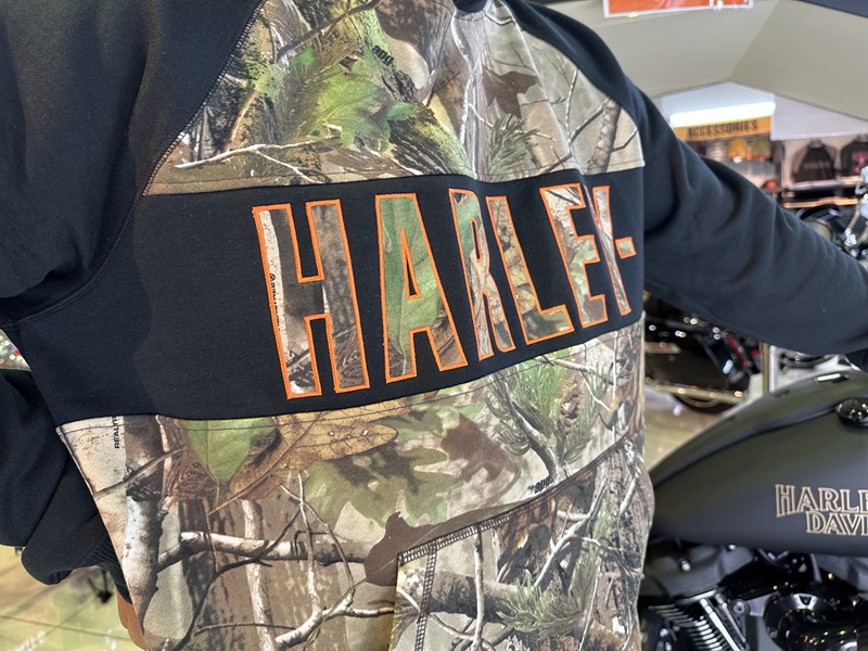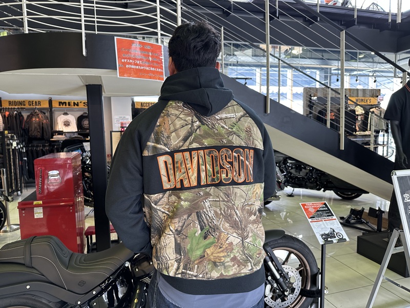 フーディーは黒と合わせたバイカラーデザイン、前後にHARLEY-DVIDSONをあしらいそのロゴもREALTREE仕様。暖かい裏起毛なのでこれからの時期に特に大活躍!