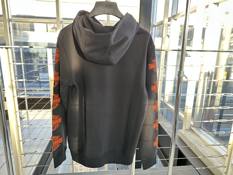 黒地にオレンジのロゴが胸元、袖にずらっと並んだデザイン。