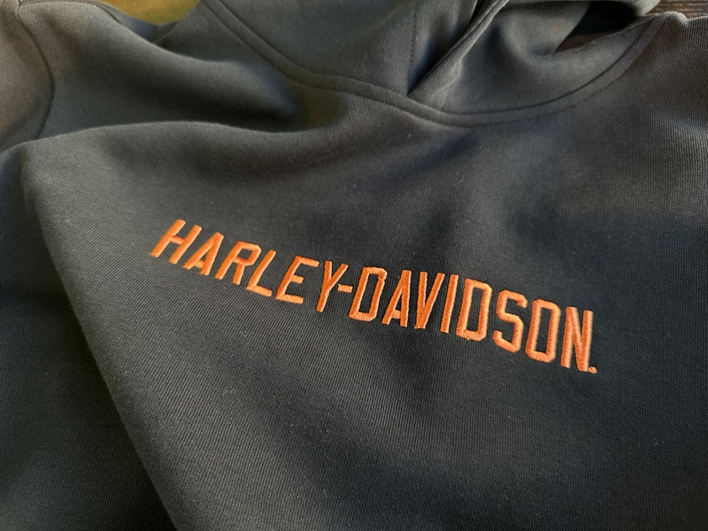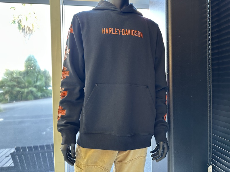 黒地にオレンジのロゴが胸元、袖にずらっと並んだデザイン。