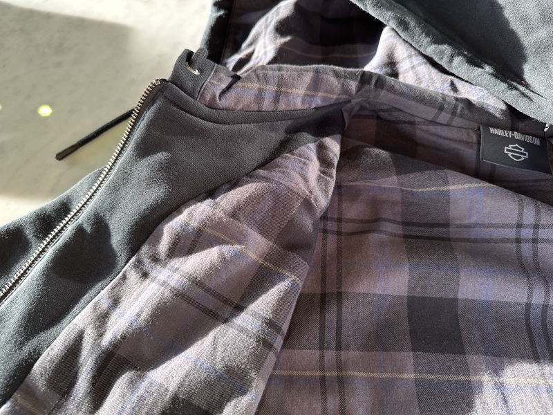 ポイントは裏地のチェック柄、ファスナーを開けるとボディからフードまでチェック柄が使われています。