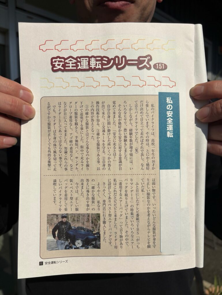 当社のお客様が、所属されている安全協会の冊子「安全運転シリーズ」にて、ご自身のバイクライフと安全運転に対する考えを綴った作文が掲載されました。長年バイクに乗り続けてきたからこそ語れる「安全とは何か」「身を守るとはどういうことか」