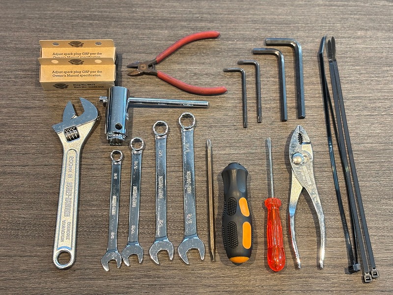 昨今の、特に、インジェクションモデル以降では車載工具の出番は少なくなってきましたが何が起こるか分からないのがバイクライフというものです。最低限持っておくと応急処置に役立つものをご紹介いたします。
