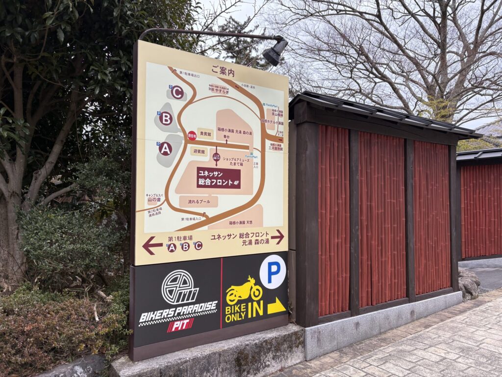 バイカーズパラダイスの看板が設置されており、施設の目の前に停める事が出来ました!