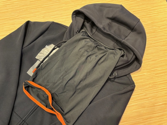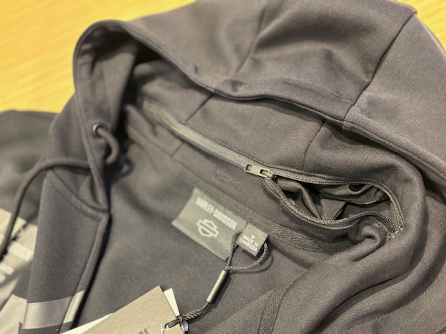 一見通常のパーカー見えますが、フードの根元にジッパー付きポケットがあります。