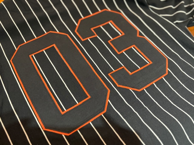 背中に「03」の刺繍パッチがはいっている、王道のベースボールシャツデザイン!