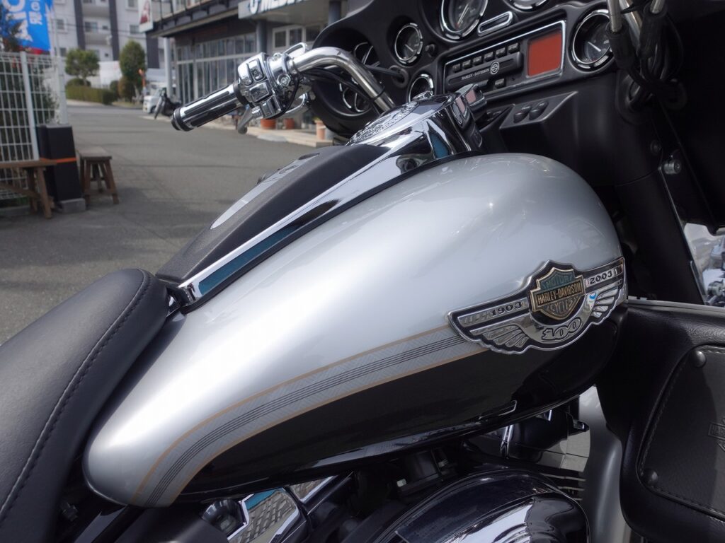 ツインカム88エンジンを搭載し、今回の車両はHD100周年記念モデル。シルバー×ブラックの外装にゴールドのホイールやエンブレムが装着された専用カラーとなります。