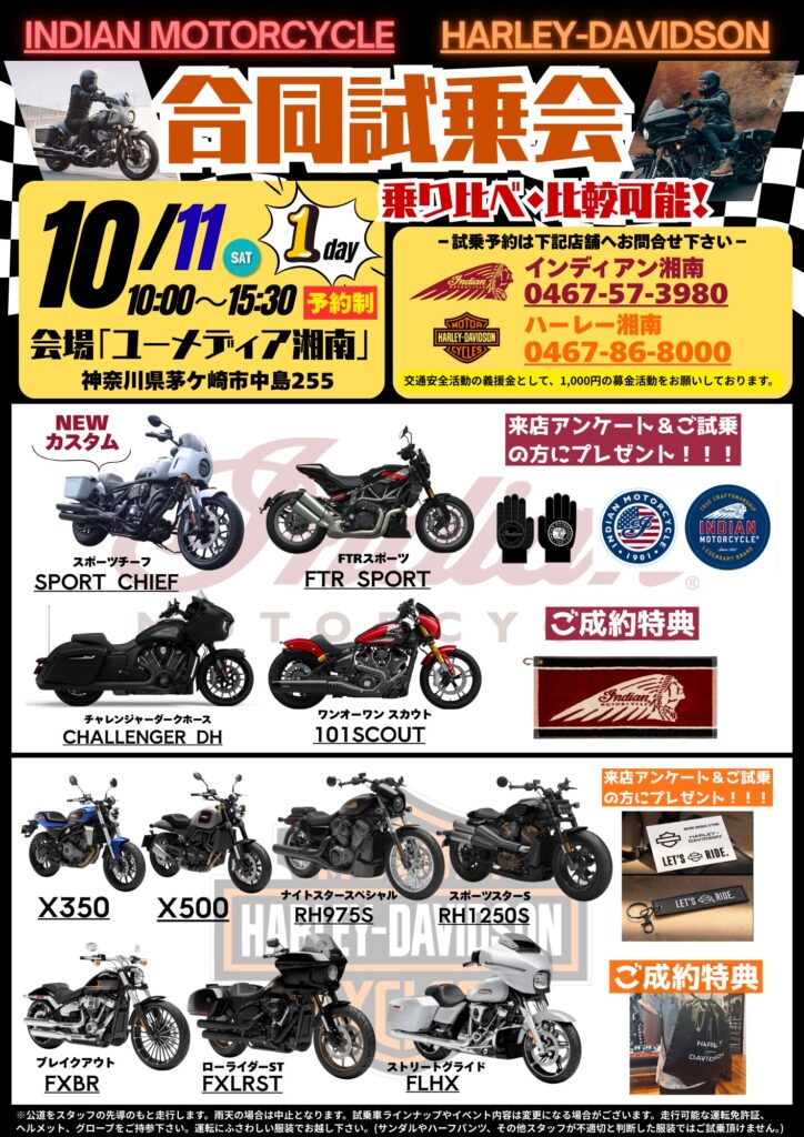 ユーメディア湘南インディアンモーターサイクルとハーレーダビッドソン湘南の合同企画「インディアン×ハーレー合同試乗会」を開催いたします! 10/11(土) 10:00~15:30(※休憩時間12:00~13:00)【会場】ユーメディア湘南本店(神奈川県茅ケ崎市中島255)... -