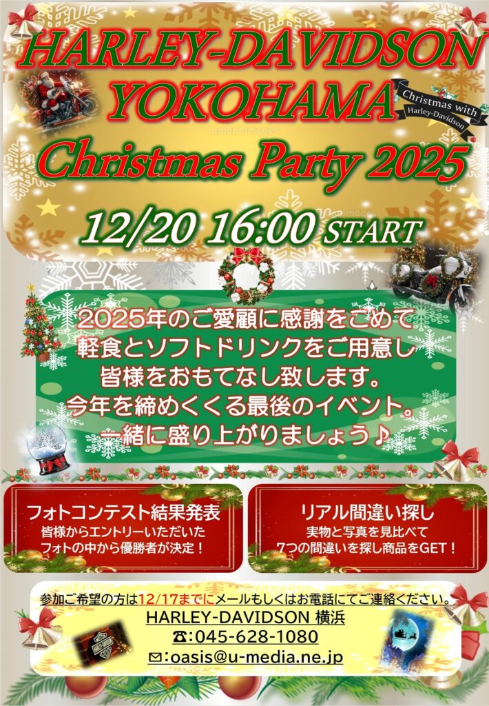 ★ HARLEY DAVIDSON YOKOHAMA ★~Christmas Party 2025~ 今年も残すところ2か月。 日頃の感謝を込めて皆様に楽しんで頂きたいとの気持ちとともに、クリスマスパーティーを開催します★ 皆様が撮影したご自身のハーレーダビッドソン思い出の中からスペシャル... -